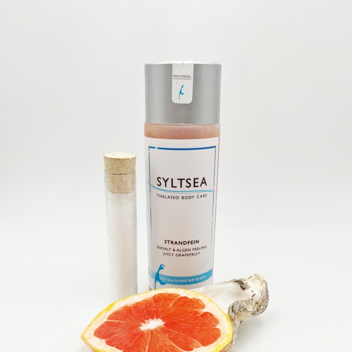STRANDFEIN Meersalzpeeling für Gesicht & Körper mit Algen, Mineralien, fruchtigem Grapefruit Extrakt und Ginseng erfrischen und vitalisieren die Haut und bieten einen stimulierenden Effekt auf Körper und Geist. Mit leicht feuchten Händen partienweise einmassieren, abduschen und samtig weiche Haut mit vitaler Entspannung genießen.